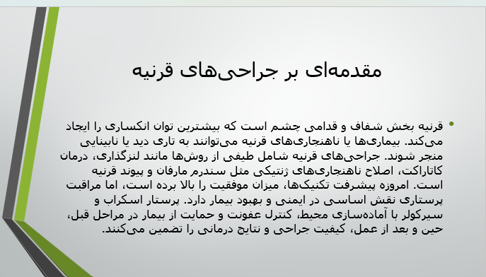 جراحی های قرنیه(سندرم مارفان ،کاتاراکت،لنز گذاری،پیوند قرنیه ) و مراقبت های قبل و حین و بعد از عمل و وظایف سیرکولر و اسکراب