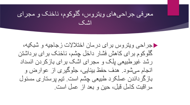 جراحی های ویتروس، گلوکوم، ناخنک و جراحی های مجرای اشک ،مراقبت ها قبل و حین و بعد از عمل ،و وظایف سیرکولر و اسکراب